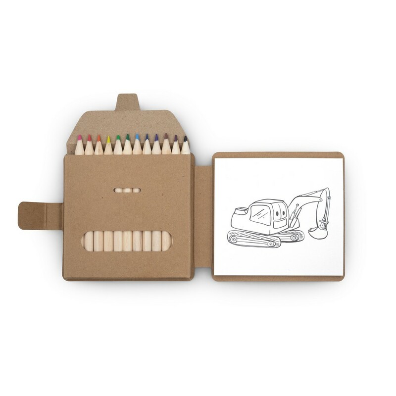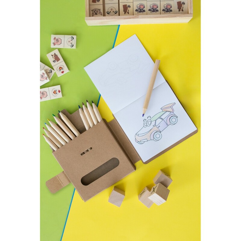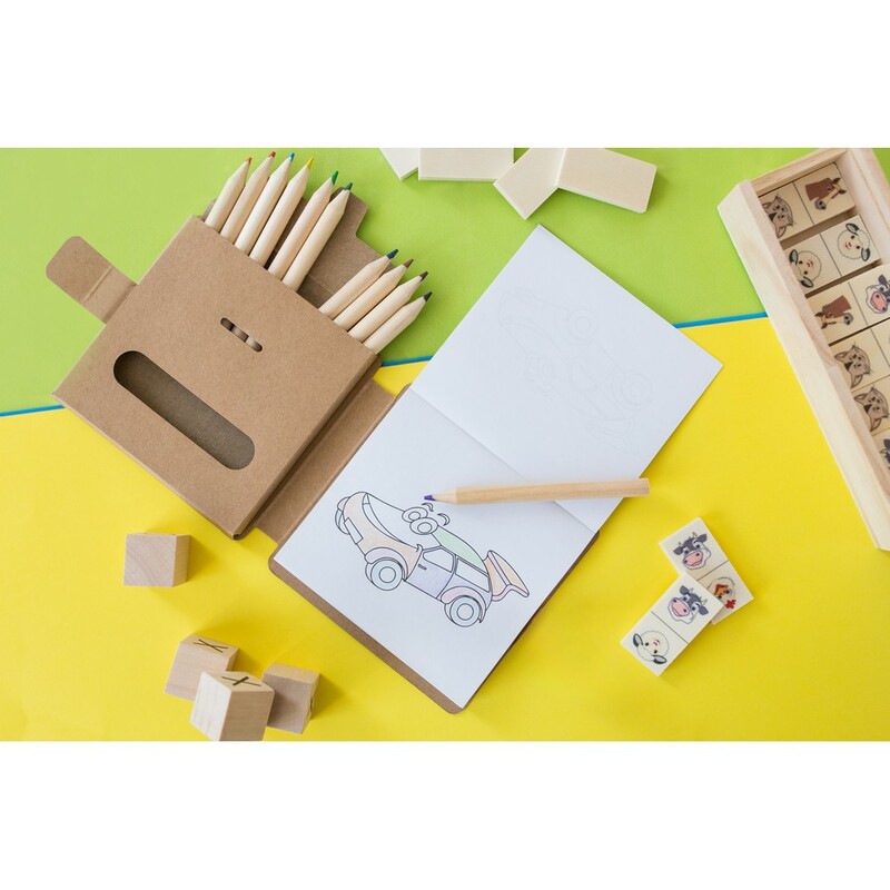 Zestaw do kolorowania, kredki | Alondra to doskonała propozycja dla osób szukających kreatywnych rozwiązań na spędzenie czasu z dziećmi, jak i efektywnego narzędzia promocyjnego w branży edukacyjnej oraz artystycznej. Ten wyjątkowy zestaw zawiera 12 drewnianych kredek ołówkowych oraz 40 kolorowanek, które z pewnością zainteresują każdego małego artystę. Całość zapakowana jest w estetyczne i ekologiczne opakowanie wykonane z kartonu kraftowego, które dodatkowo chroni kredki dzięki wbudowanemu kartonowemu etui.